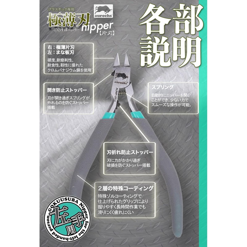 aurochs Ultra-Thin Blade Nipper, For Left Hand, Thin Blade, Single Edge, Tool, Plastic Model, Gray & Mint