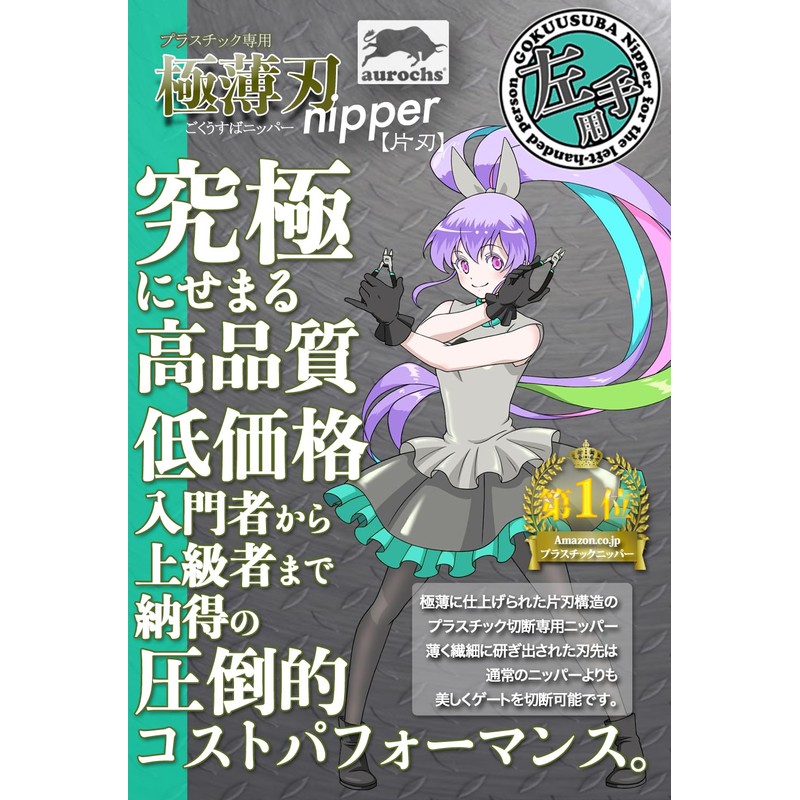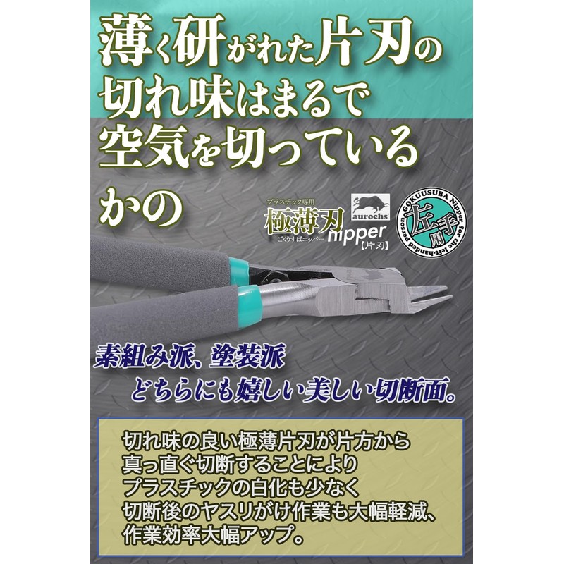 The ultimate in quality and low price. This model has been optimized for working with the left hand (left hand) by placing the cutting blade and cutting board blade in reverse positioning. Overwhelming cost performance that is convinced by beginners to advanced users. Specially designed nipper for cutting plastic with a single-blade construction with an ultra-thin finish. The thin and delicately sharpened edge allows you to cut the gate more beautiful than regular nippers. By cutting straight from one side with a good sharpness, the plastic whitening is reduced, and it greatly reduces sanding after cutting, and greatly improves work efficiency.