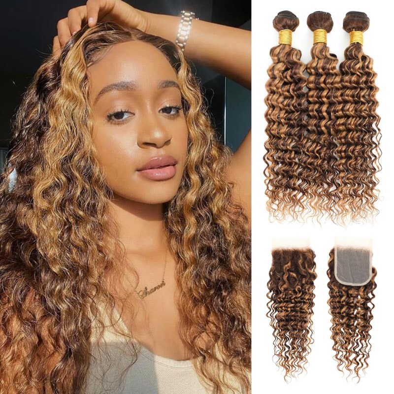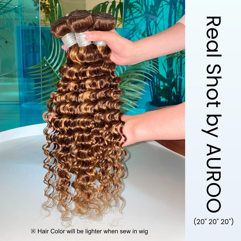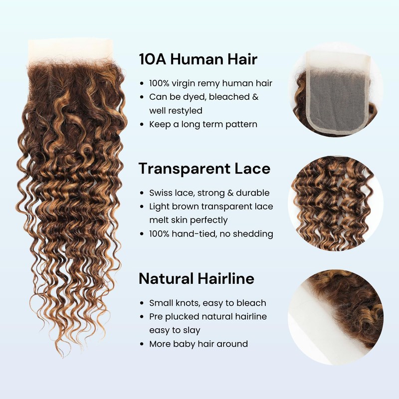AUROO Honey Blonde Highlight Brazilian Deep Wave Human Hair Bundles with Closure, 10A Soft Thick Ombre Brown Curly 100% Human Hair Bundle with Free Part HD Transparent Lace 4x4 Closure (10 12 14 + 10)