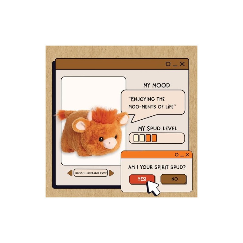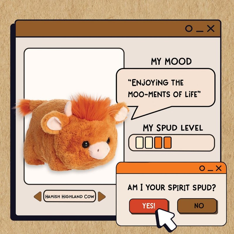 - Meet Hamish Highland Cow, the plush cow with a twist, from our popular Spudsters collection. The charm of the Scottish Highlands meets the playfulness of a potato! Hamish is no ordinary plush; it features a unique potato-like body and an irresistibly fluffy mane that captures the essence of a Highland cow. Made from high quality, soft materials, Hamish is ready for a life of cuddles and adventures.