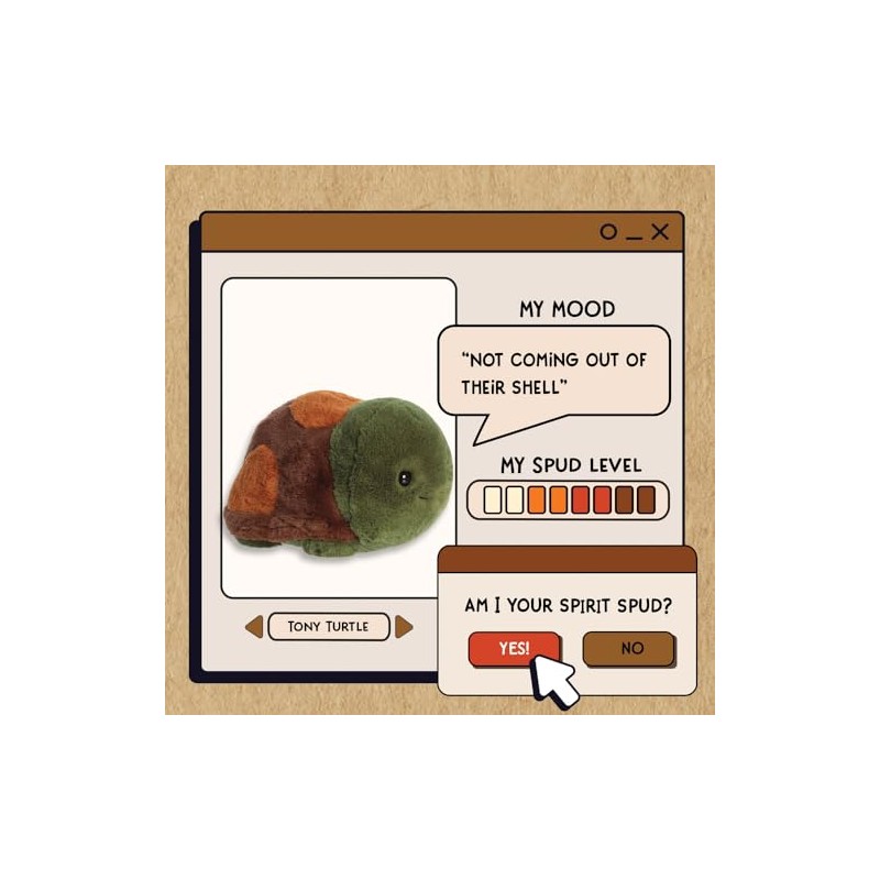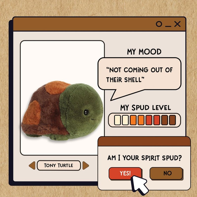 • Meet Tony Turtle, the plush turtle with a twist, from our beloved Spudsters Collection. Tony's potato-shaped form is as unique as it is huggable, featuring a soft green shell accented with brown patches and an irresistibly cute face. Crafted from premium, soft materials, Tony is ready for a lifetime of cuddles and adventures.