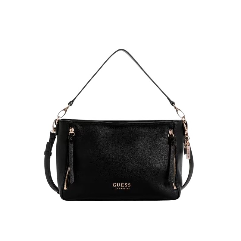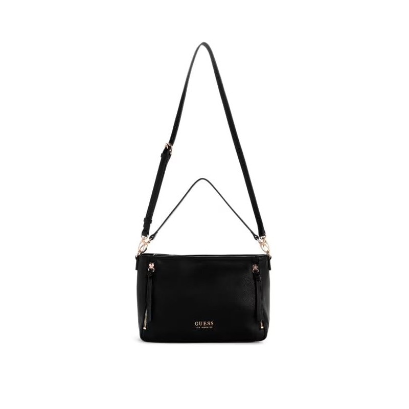 - GUESS Factory Women's Aurore Top Zip Crossbody Pebbled faux-leather crossbody bag Gold-tone hardware and logo emblem Exterior zipper details Midsize silhouette Interior lining and pocketing Shoulder strap with removeable keychain. Detachable crossbody strap. Top zip closure 13"W x 7.75"H x 4.25"D