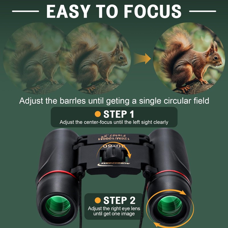 - EASY TO FOCUS: Open the folding mini binoculars to fit your pupil distance, then turn the smooth "center focus knob" and "right eye lens" to focus slowly. Our folding binoculars are suitable for both adults and children.