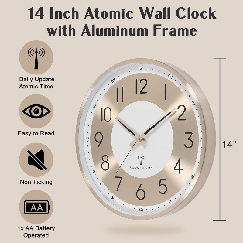 Aurowit Atomic Analog Wall Clock 14 Inch Battery Operated Wall Clocks Radio Controlled Clock Sets Automatically Gold Large Wall Clock Decor Kitchen Living Room Bedroom