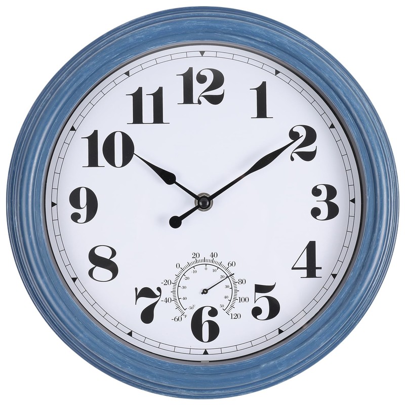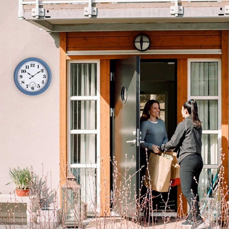 Aurowit Outdoor Wall Clock 12 Inch Waterproof Outdoor Clocks with Thermometer Wall Clock Battery Operated Non-Ticking for Patio Pool Garden, Retro Light Blue
