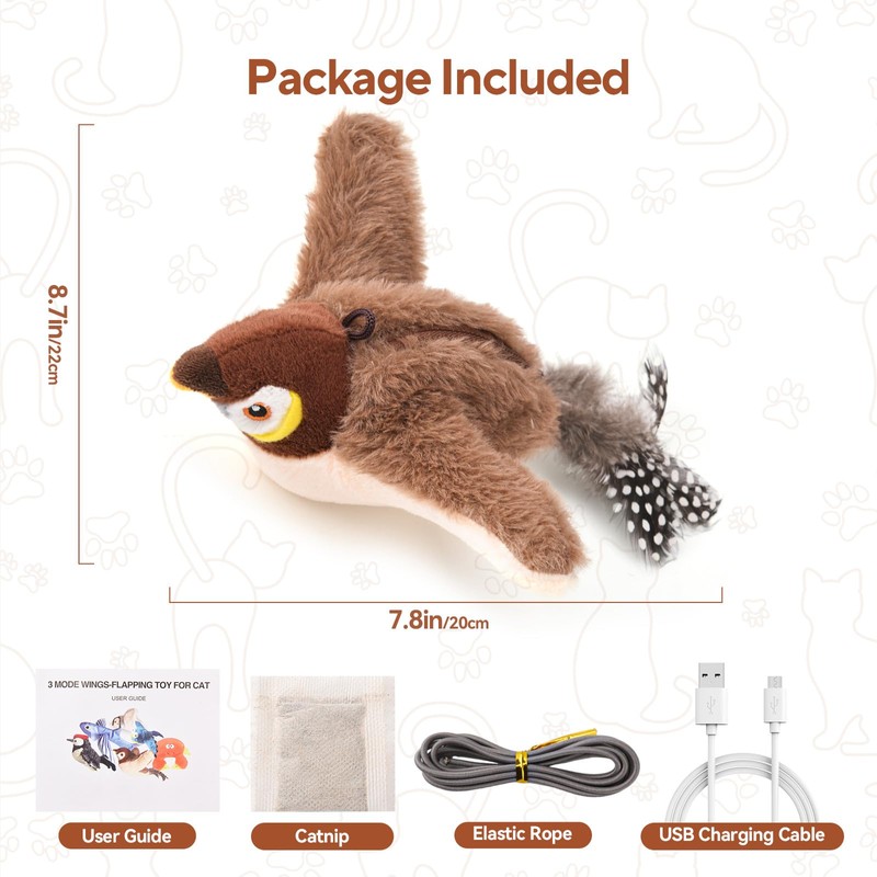 - 【Three Flapping Modes】: Our bird cat toy offers common, intermittent, and fast flapping modes that cycle automatically. After starting, the toy flaps for about 17 seconds before entering a short sleep mode—the next time it activates, it switches to the next mode, creating a dynamic and engaging experience for your cat. If left untouched for a while, the toy will go into sleep mode to save energy. This cat bird toy can make your cats feel like they're interacting with a real bird! It’s perfect for satisfying their natural hunting instincts and keeping them entertained for hours.