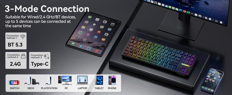 The hot-swappable keyboard supports 3-pin or 5-pin switch replacement, and you can freely replace the keys according to your preference without soldering.
