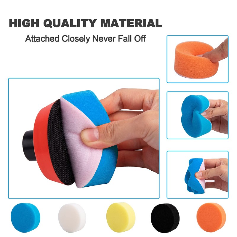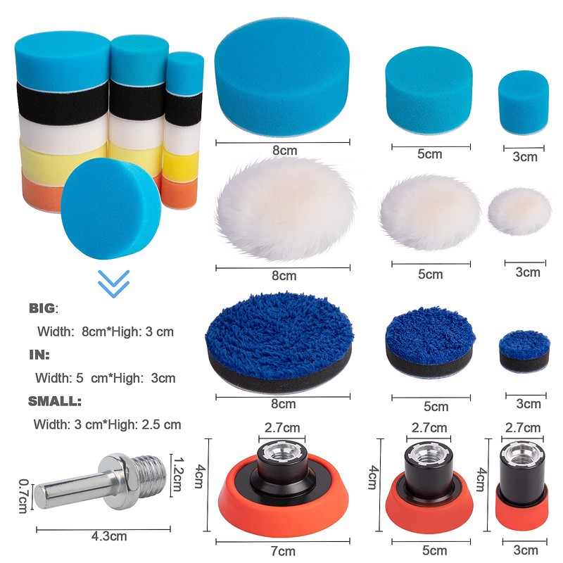 - 36-piece professional polishing sets: car polishing pads in different colours and designs, contains 23 pieces polishing sponge (30 mm, 50 mm, 80 mm) + 9 pieces pad + 3 pieces adhesive discs + 1 piece thread adapter one piece M14, easily distinguish between fine/medium/coarse polishing and mirror polishing wool pads. It can meet many polishing requirements.