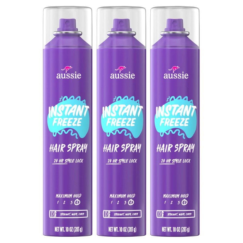 Max out your style with Aussie Instant Freeze Hair Spray. Its maximum hold keeps your style on lock for 24 hours.Straight hair, wavy hair, or curly hair--this spray doesn’t care. It’s made for all hair types. The bright citrus scent will make you smile and so will the fact that it’s certified PETA Cruelty-Free.To keep your style on point, hold the can 8 to 10 inches away from your hair. Spray in short bursts to finish your look. It’s as easy as that.