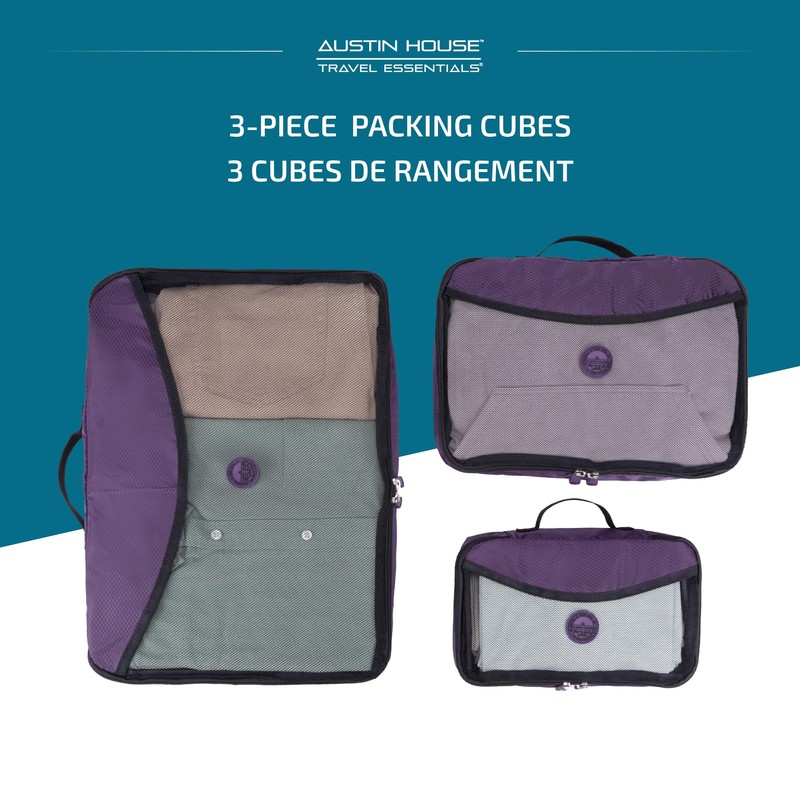 Austin House Travel Essentials Packing Cubes For Luggage — Set Of Three To Organize Your Suitcase, With Mesh Ventilation And Carry Handle, Zippered, Washable — Purple
