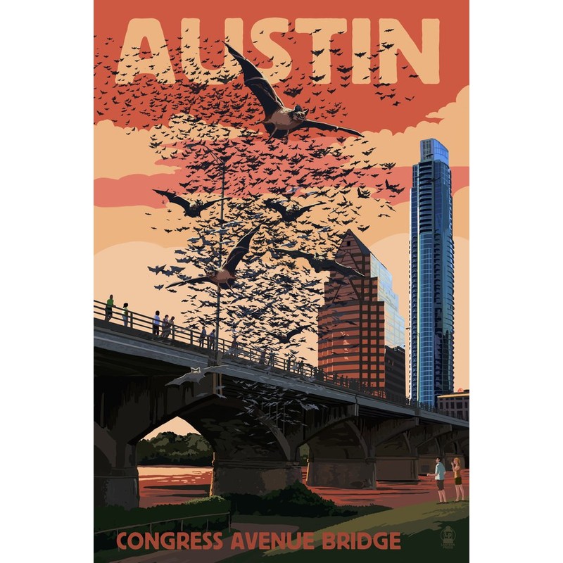 Austin, Texas - Bats and Congress Avenue Bridge (24x36 Giclee Gallery Print, Wall Decor Travel Poster)