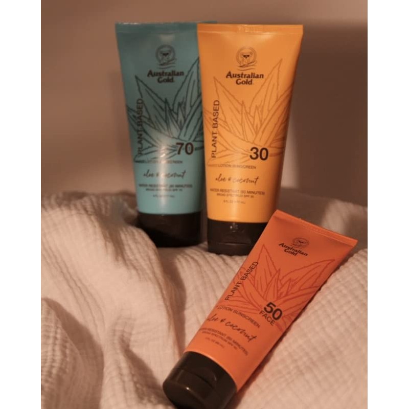 - Australian Gold SPF 70 plant Based lotion uses the natural and effective power of plants to support healthy skin. Made with Aloe Vera and Coconut Oil, this lotion is packed with nutrients your skin will love.