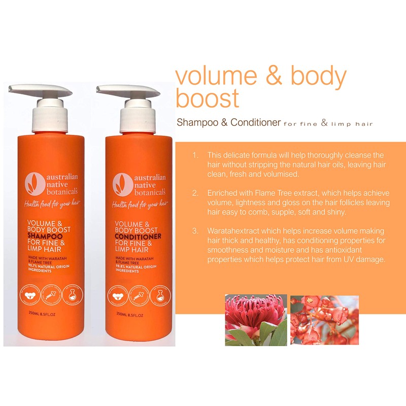 - Enriched with native Australian botanicals obtained by cellular extraction. For best results use in conjunction with volume and body boost conditioner Luxurious, plant based hair care, to increase thickness and volume of the hair.