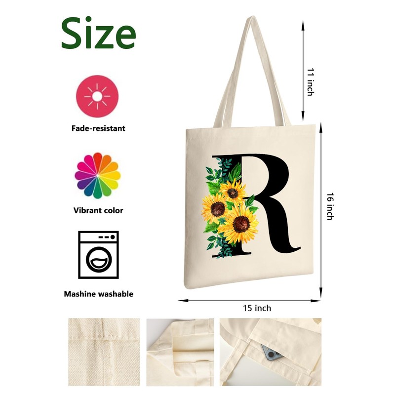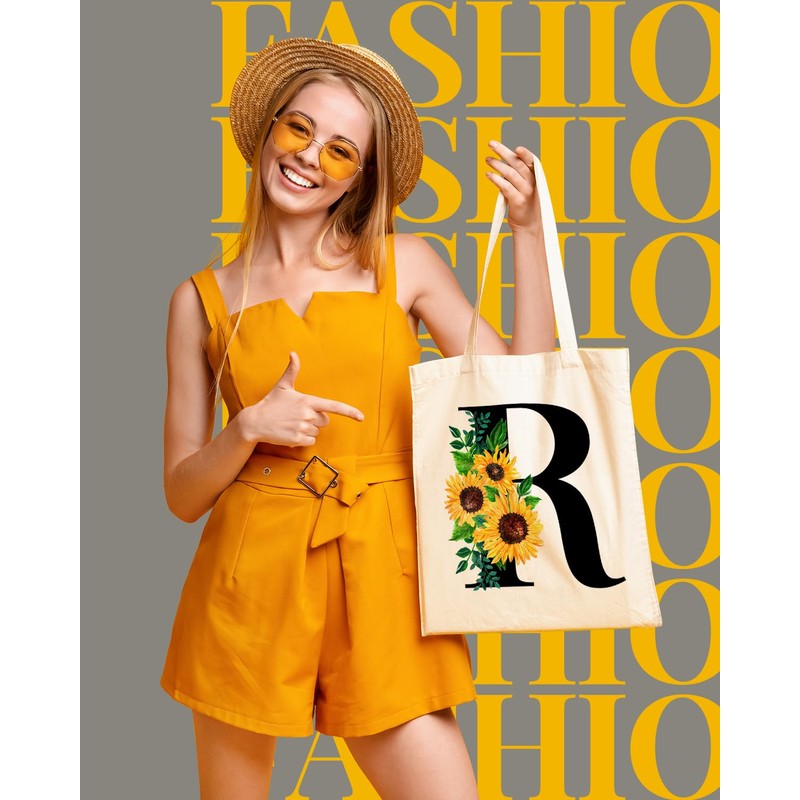 AUSVKAI Canvas Tote Bag Aesthetic for Women, Cute Sunflower Initial Trendy Monogram Personalized Initial Birthday Reusable Cloth Cotton Bags with Handle for Grocery College Shopping Beach