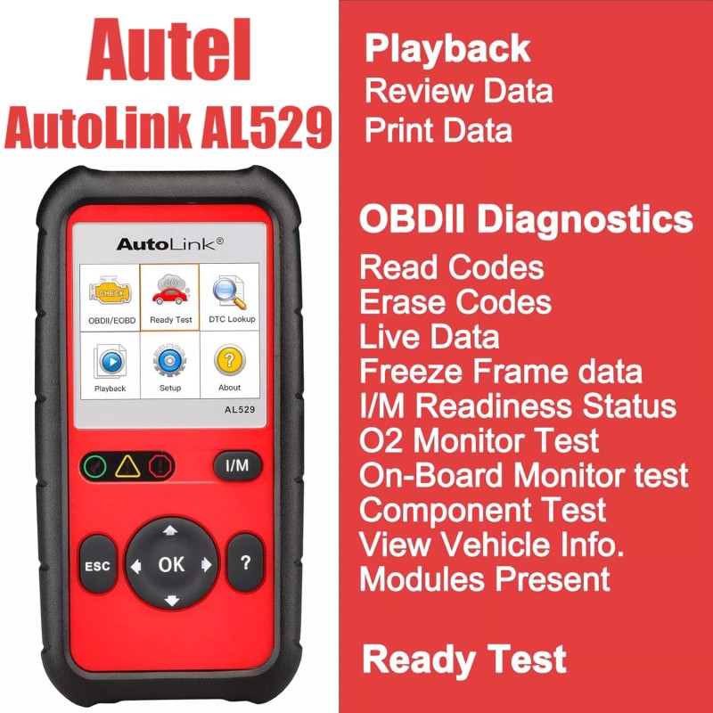Autel AutoLink AL529 OBDII Code Reader supports all 10 modes of OBDII test for complete vehicle diagnostics. The easy-to-use tool features a TFT color display and built-in speaker for visual and audible message cues and the patented One-Click I/M Readiness Key.