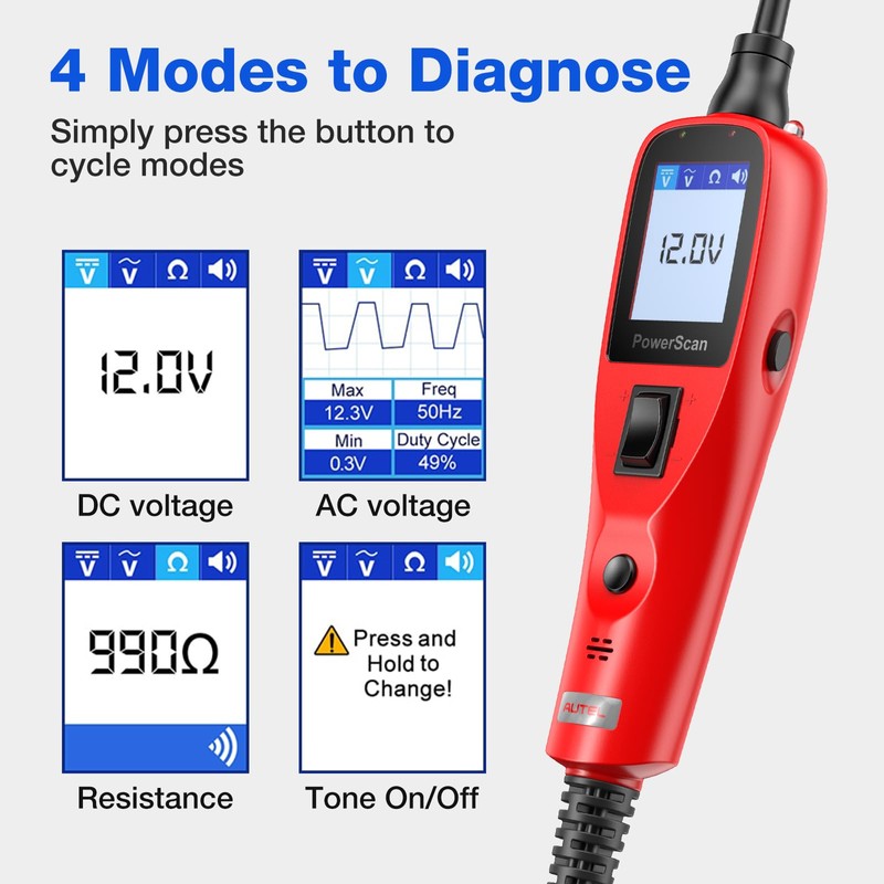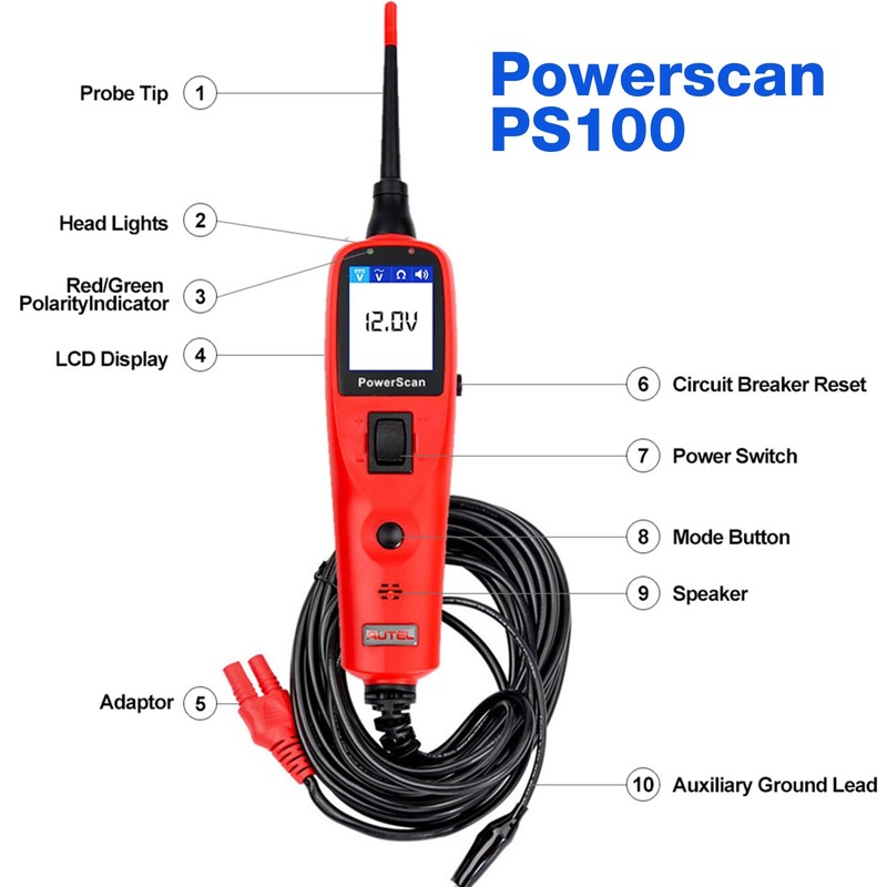 - Autel PowerScan PS100 is the best Electrical Tester for reducing diagnostic time in all 6- to 30-volt vehicle electrical systems. After a simple hook-up of the tool to the vehicle's battery, you can: ✅Test Voltage & Polarity/ Continuity/Signal Circuit✅Activate Components in Your Hand & in the Vehicle & w/Ground✅Test Trailer Lights and Connections✅Find Bad Ground✅Find Short Circuits✅Red/Green Polarity LED.