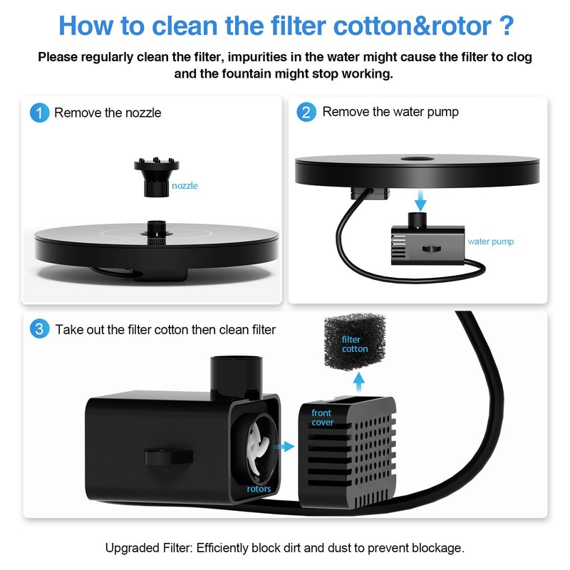 - Water-shortage protection: It will stop working when it leaves the water; Filtration box can efficiently block the dirt, dust, and leaves to extends its service life; With PET laminated solar panel, the solar fountain can still work in a bad environment