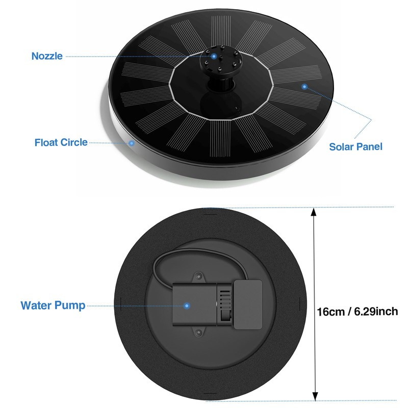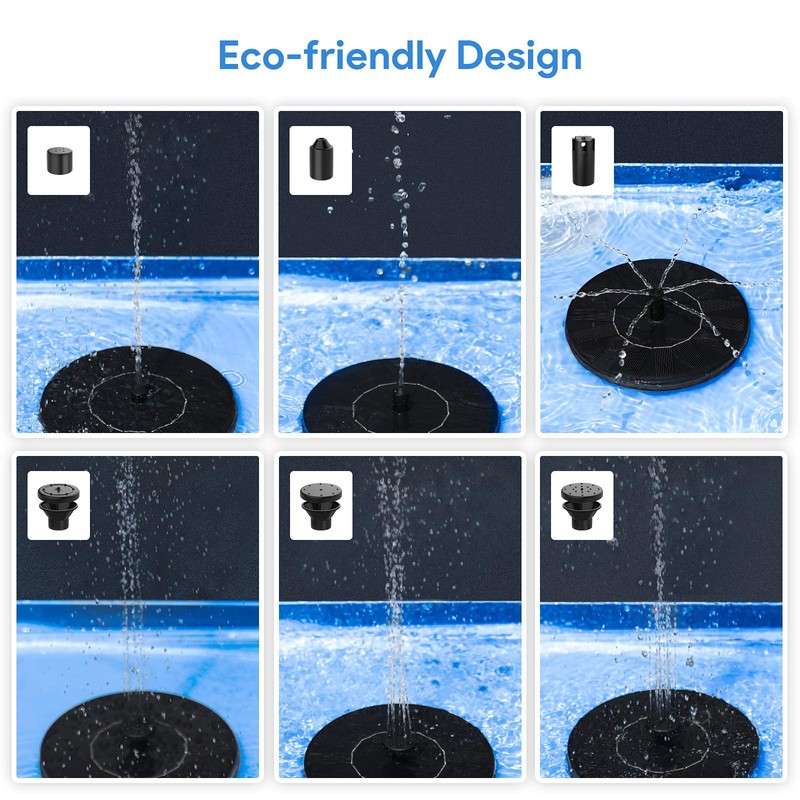 - 6 Water Sprayer Style: It comes with 6 different types of nozzle heads; You can change the nozzles to adjust the water height easily; Straws help avoid the solar fountain from moving randomly; Just enjoy the serenity from the trickling sound of water