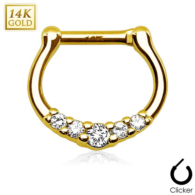 Autiga Nose Piercing 14 Carat 585 Real Gold Septum Ring Clicker Nose Ring Folding Piercing Nose Zirconia Crystal, Yellow Gold
