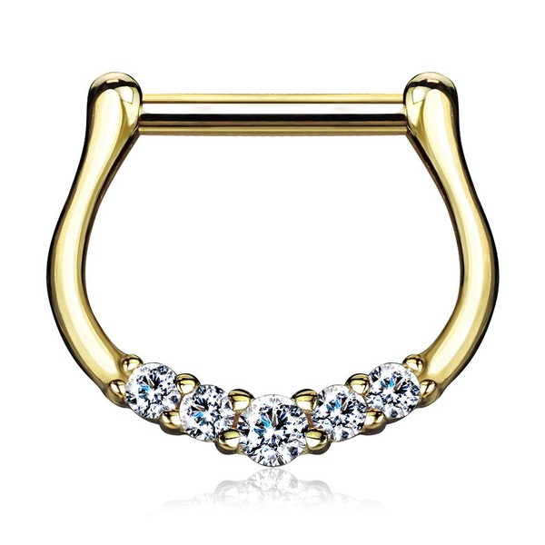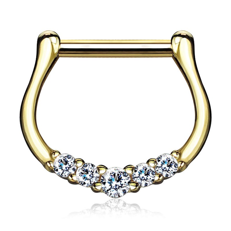 The septum ring is made of high-quality materials and the extraordinary horseshoe shape and the sparkling zirconia stones make this piercing a real eye-catcher.
