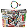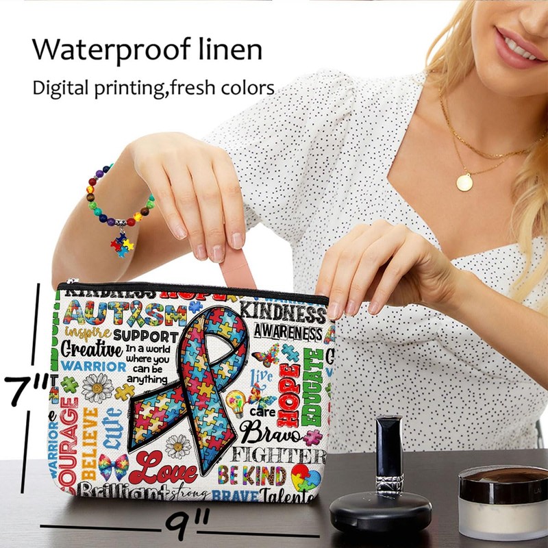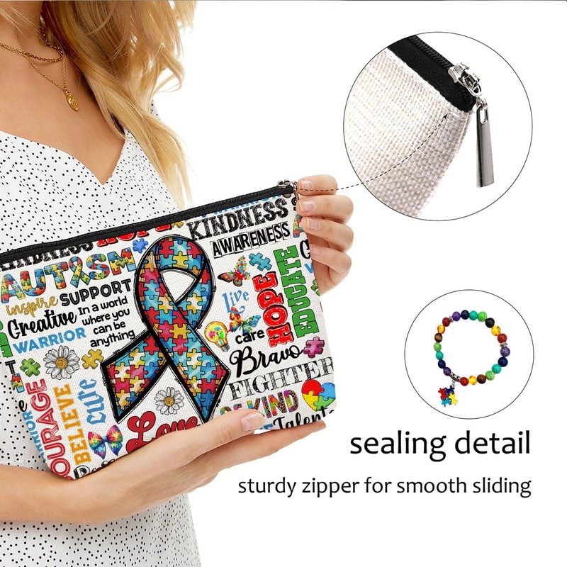 Autism Puzzle Ribbon Makeup Bag for Women Teacher Mom, Large Capacity Makeup Pouch Travel Organizer Toiletry Cosmetic Bag, Autistic Puzzle Elastic Natural Stone Beaded Bracelet, Gifts for Women 1