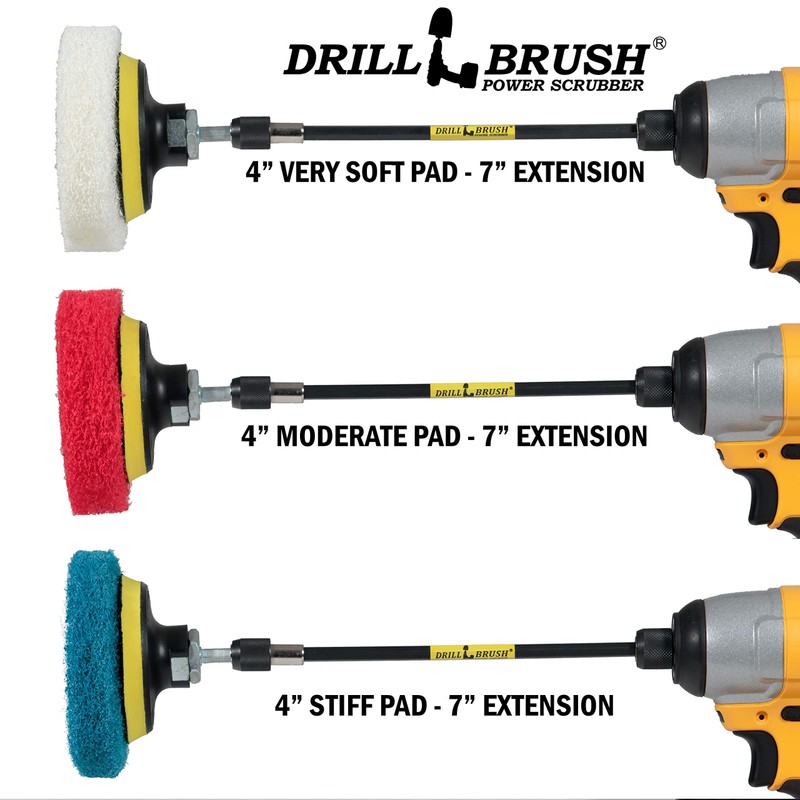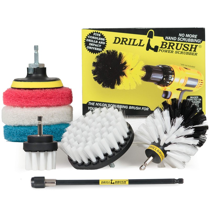 - DRILLBRUSH KIT Soft white bristle cleaning kit includes an Original Drillbrush Power Scrubber brush, a 4 inch flat brush, and a 2 inch detailing brush. Also included are three different scrub pads for household cleaning in your kitchen and bathroom. Use the included 7 inch extension for added reach and accessibility in tight spaces.