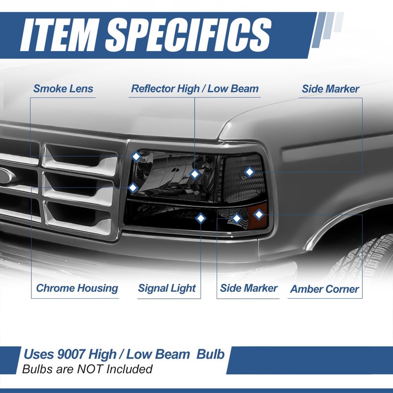 • Product Specific - Bulb Type: Halogen | Beam Type: Amber Reflector | Bulb Model: 9007 High / Low Beam (Not Included) | Signal Light: 3157A (Not Included) | Housing Color: Chrome | Lens Color: Smoked | OEM Part Number: F2TZ13008A F2TZ13008B | Parkslink Number: FO2503114 FO2502118 FO2550110 FO2551108