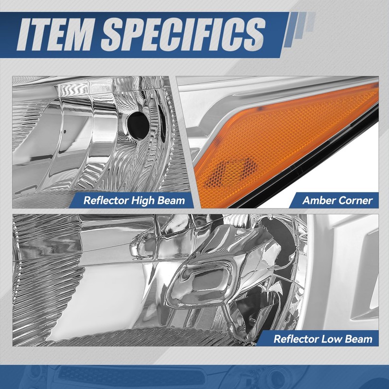- Product Specfics - Bulb Model: H11 Low, 9005 High, 168 Marker, 7440 Turn Signal | Lamp Type: Halogen | Lens Color: Clear / Amber | Housing Color: Chrome Housing | OEM Part Number: CJ5Z13008D FD6331350ALS | Partslink Number: FO2502309