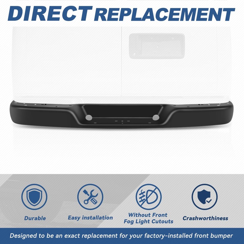 Upgrade and replace your standard or worn Front bumper with a new one. Manufactured to be a direct replacement, installation is as simple as removing the old one and installing the new one.