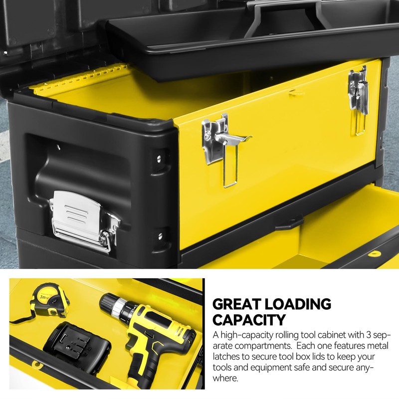 • High-Capacity Storage - The rolling tool cabinet boasts 3 separate compartments, each secured with metal latches to keep your tools and equipment safe and organized on the go.