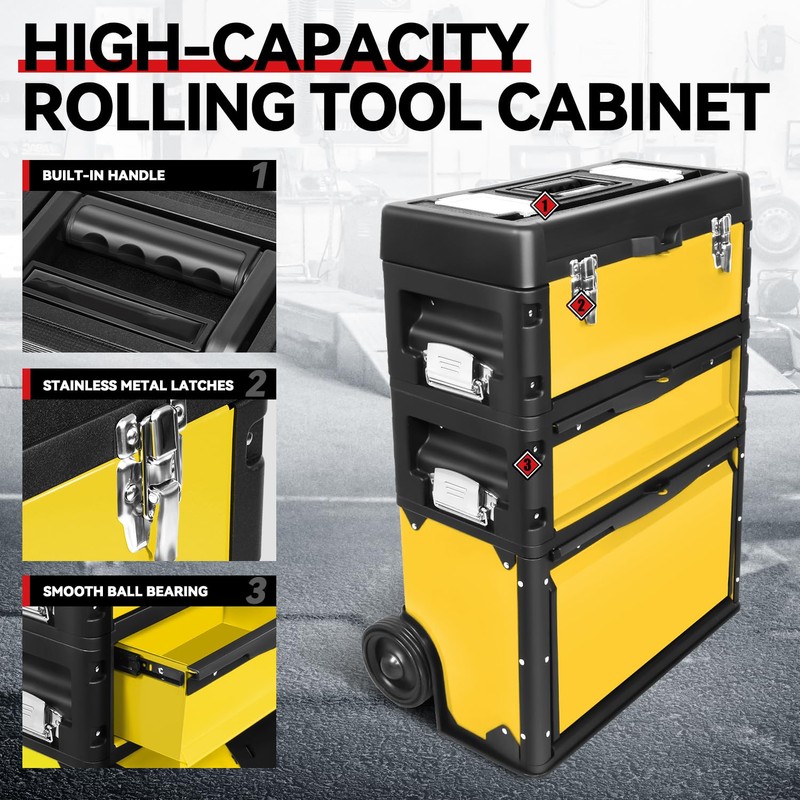 Auto Dynasty Stackable Tool Box 3-Tier Tool Separate Organizer Rolling Tool Chest with Wheels 3-in-1 Upright Trolley Tool Chest for Garage or Workshop, Yellow