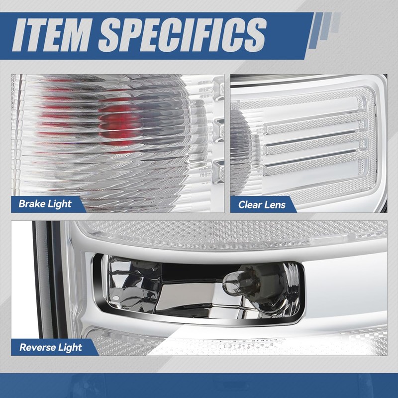 - Product Specifics - Bulb Type: Halogen | Signal / Brake Light: 4057 (Not Included) | Reverse Light: 912 (Not Included) | Housing Color: Chrome | Lens Color: Clear | Item Weight: 5LBS | OEM Part Number: BL3Z13405B BL3Z13404B | Partslink Number: FO2818143 FO2819143