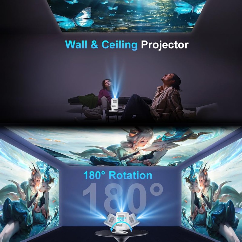 - 【Multi-Device Connection & 180° Adjustable Stand】From mini projector 4K nights to gaming marathons, this adaptable tv projector meets all needs. The 120° tilt-adjustable stand lets you project onto walls, ceilings, or even angled surfaces in your bedroom, while HDMI, USB-C, and 3.5mm audio support Fire Stick, PS5, Nintendo Switch on this versatile Small projector. The built-in adjustable stand enables ceiling installations or outdoor mini projector setups, Perfect as a projector for bedroom or portable entertainment system.