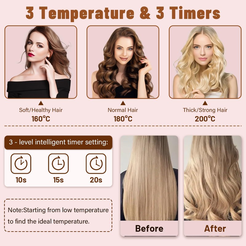 - 【Versatile Temperature Settings】Our automatic curling iron is equipped with 3 temperature options ranging from 160°C to 220°C, making it suitable for all hair types. Whether you prefer relaxed beach waves or tight curls, this hair curler automatic rotating wand ensures optimal results every time.