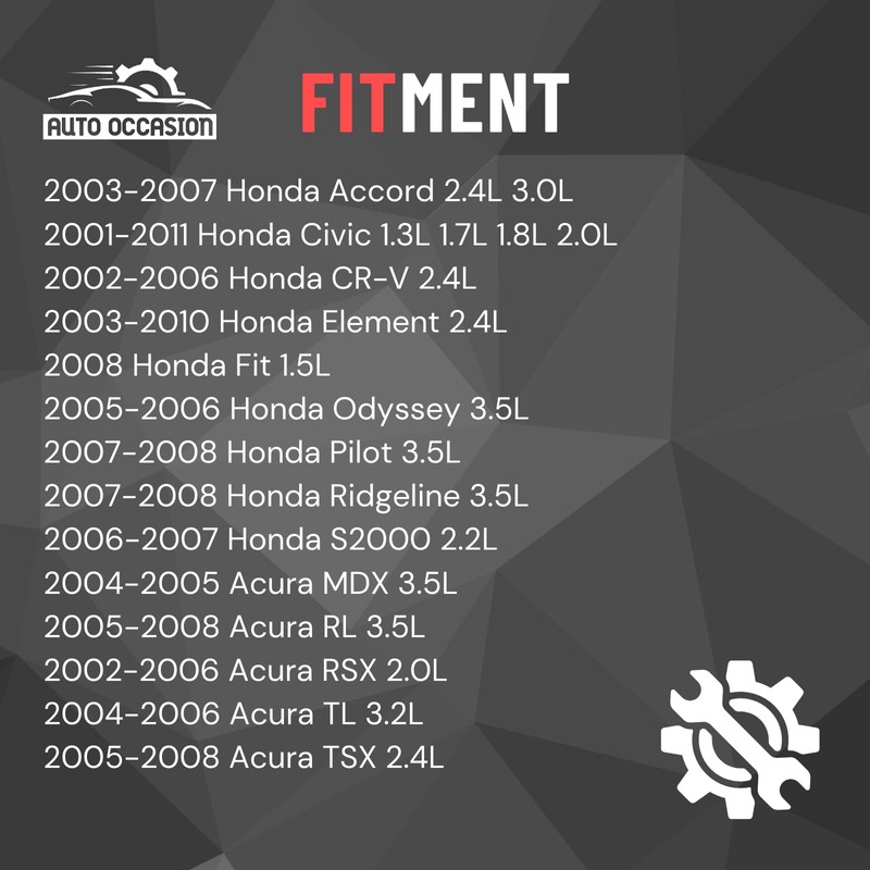 - FITMENT:Compatible with 2003-2007 Honda Accord 2.4L 3.0L,2001-2011 Honda Civic 1.3L 1.7L 1.8L 2.0L,2002-2006 Honda CR-V 2.4L,2003-2010 Honda Element 2.4L,2008 Honda Fit 1.5L,2005-2006 Honda Odyssey 3.5L,2007-2008 Honda Pilot 3.5L,2007-2008 Honda Ridgeline 3.5L,2006-2007 Honda S2000 2.2L Compatible with 2004-2005 Acura MDX 3.5L,2005-2008 Acura RL 3.5L,2002-2006 Acura RSX 2.0L,2004-2006 Acura TL 3.2L,2005-2008 Acura TSX 2.4L.