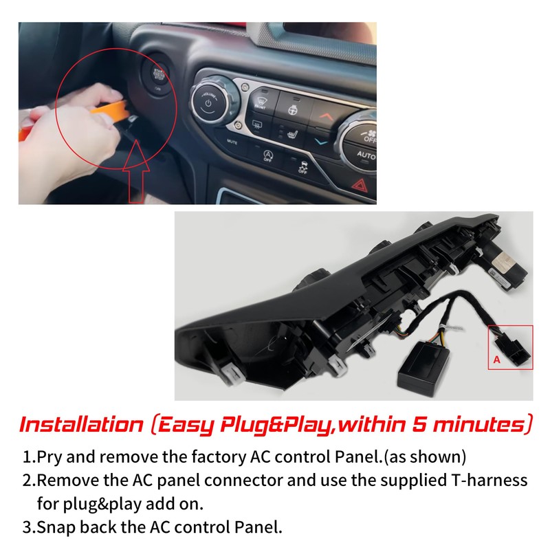 - 【Installation】Our Wrangler Gladiator Auto Start Stop Eliminator easy to install.100% Plug-and-Play, within 5 minutes.STEP:1.Pry and remove the factory AC control Panel.(as shown)2.Remove the AC panel connector and use the supplied T-harness for plug&play add on.3.Snap back the AC control Panel.