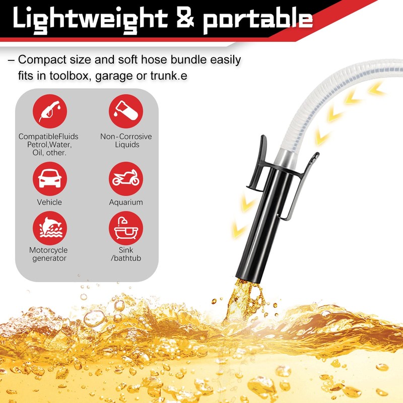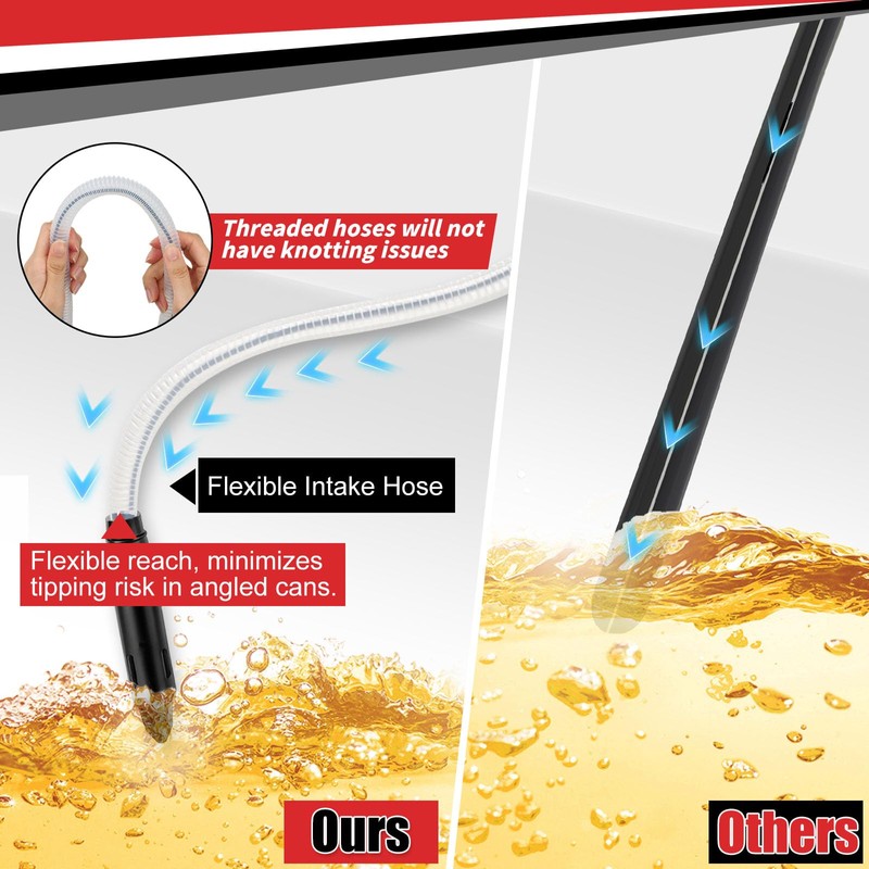 - 𝐅𝐥𝐞𝐱𝐢𝐛𝐥𝐞 𝐔𝐩𝐠𝐚𝐫𝐝𝐞𝐝 𝐇𝐨𝐬𝐞 𝐃𝐞𝐬𝐢𝐠𝐧 Unlike the previous straight pipe, our newly designed flexible and bendable intake hose can easily reach the bottom of oil drums, fuel tanks, or containers, ensuring maximum liquid extraction without residual waste