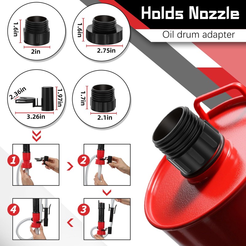 - 𝟑 𝐃𝐢𝐟𝐟𝐞𝐫𝐞𝐧𝐭 𝐒𝐢𝐳𝐞 𝐀𝐝𝐚𝐩𝐭𝐞𝐫𝐬 Included are 3 gas can adapters (2.0inch; 2.1inch; 2.75inch) that are compatible with most North American standard fuel cans, meeting various oil drum requirements. The hose, made of durable polyethylene plastic, is rustproof, corrosion-resistant, and suitable for long-distance transfers