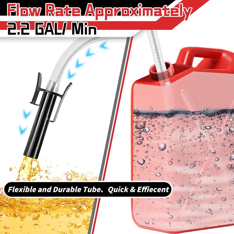 - 𝟐.𝟐𝐆𝐏𝐌 𝐄𝐟𝐟𝐢𝐜𝐢𝐞𝐧𝐭 𝐅𝐮𝐞𝐥 𝐓𝐫𝐚𝐧𝐬𝐟𝐞𝐫 𝐏𝐮𝐦𝐩 With sufficient battery power supply, the gas can fuel transfer pump can achieve up to 2.2GPM flow rate, making refueling vehicles and equipment quick and hassle-free. It can be used for transporting gasoline, kerosene, diesel, non-potable water, and more