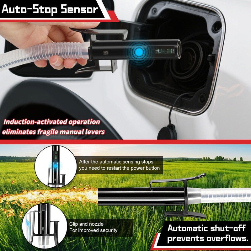 - 𝐒𝐦𝐚𝐫𝐭 𝐒𝐚𝐟𝐞𝐭𝐲 𝐀𝐮𝐭𝐨-𝐬𝐭𝐨𝐩 𝐒𝐞𝐧𝐬𝐨𝐫 𝐂𝐨𝐧𝐭𝐫𝐨𝐥 Our gasoline transfer pump is equipped with an auto-stop sensor in the nozzle to prevent spills, leaks, and overflows. This feature enhances safety and reduces the risk of fuel spills in the work environment.After the automatic sensing stops, you need to restart the power button