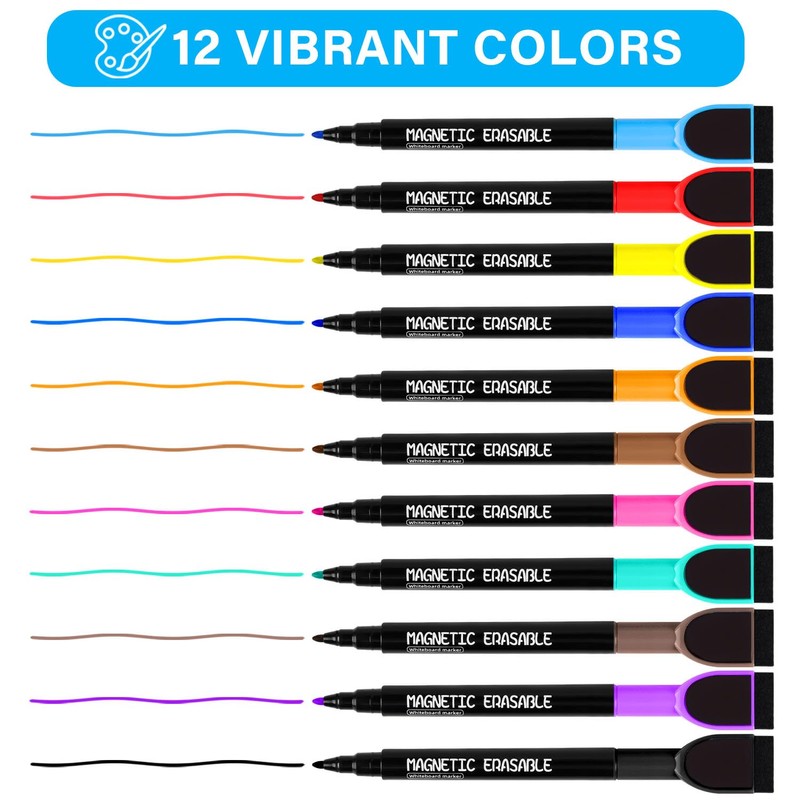 - Rich colours: the whiteboard marker set with 12 different bright colours, contains black, brown, light brown, purple, blue, light blue, green, light green, red, orange, yellow and pink. The wipe clean foil pen can be used for highlighting, writing, marking and recording
