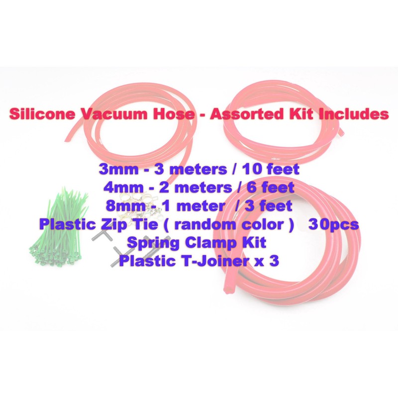 - Kit includes: 3 Pieces of Silicone Vacuum Hose : ID= 0.12" (3mm) x 10FT (3Meter) + ID= 0.16" (4mm) x 6FT (2Meter) + ID= 0.31" (8mm) x 3FT (1Meter)