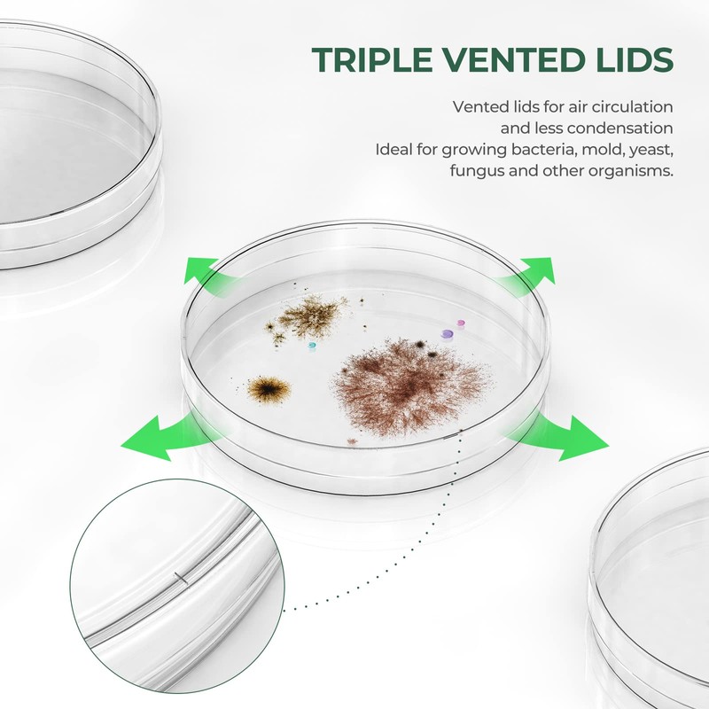 • 3 Vented Lids: Each petri plate has 3 lids so that there is improved air circulation and less condensation, Ideal for growing bacteria, mold, yeast, fungus and other organisms.
