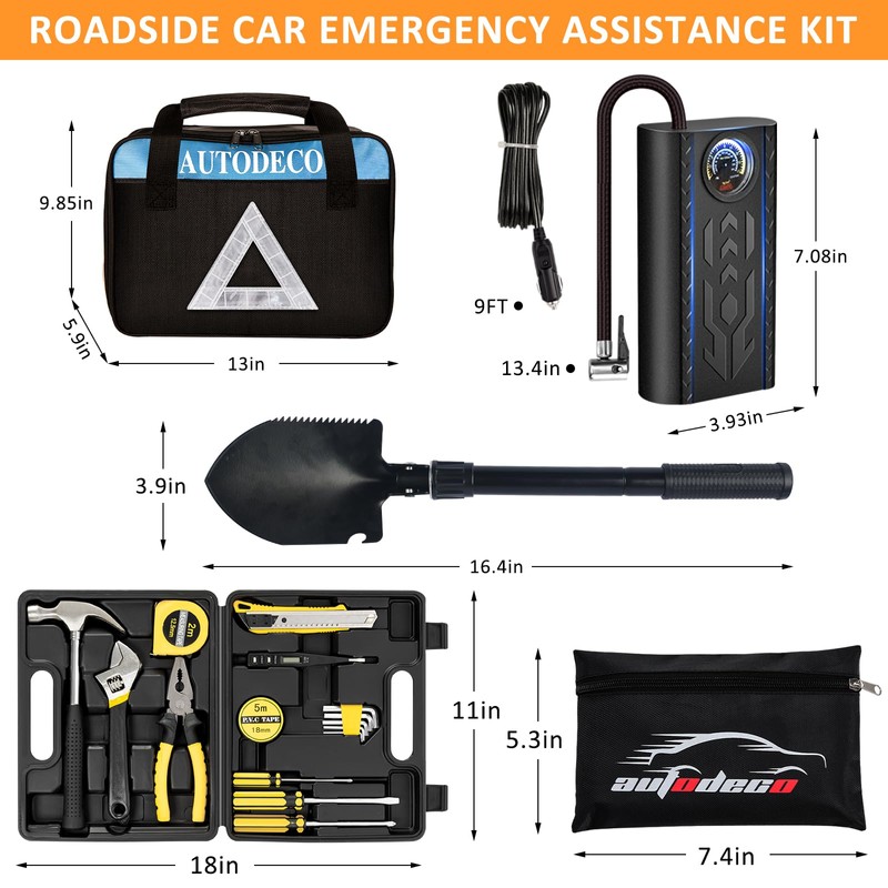 AUTODECO 105 PCS Roadside Car Emergency Assistance Kit with Portable Air Compressor Jumper Cables