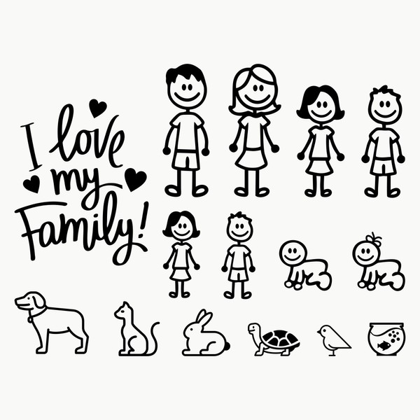 - Pack of 15 stickers: each package consists of 15 family members, father, mother, middle child, medium child, toddler, toddler girl, baby boy, female baby, dog, cat, rabbit, turtle, bird, fish and extra stickers: I love my family.