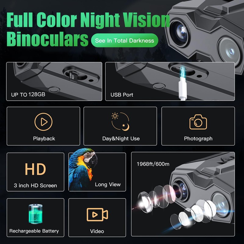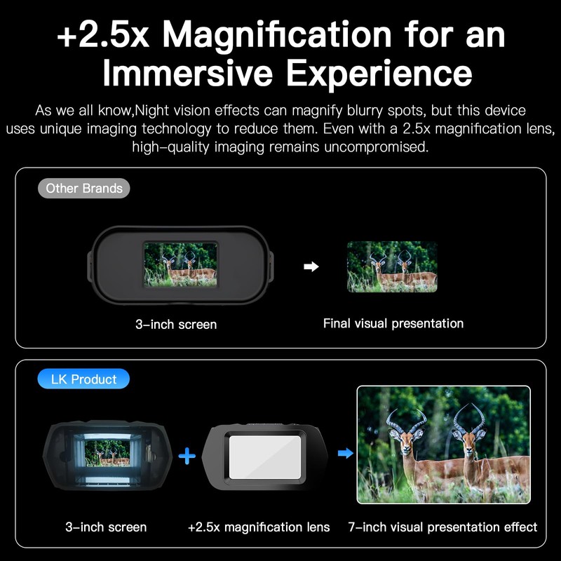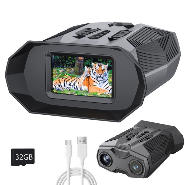- 【High-Definition Viewing】Featuring a 3-inch high-definition screen, With 2.5x magnification, you can see nearly 7x visual display.1920*1080 video resolution, and a maximum of 10MP photo pixels, these night vision binoculars provide clear and vivid views. The included USB data cable allows you to easily transfer files to your computer.