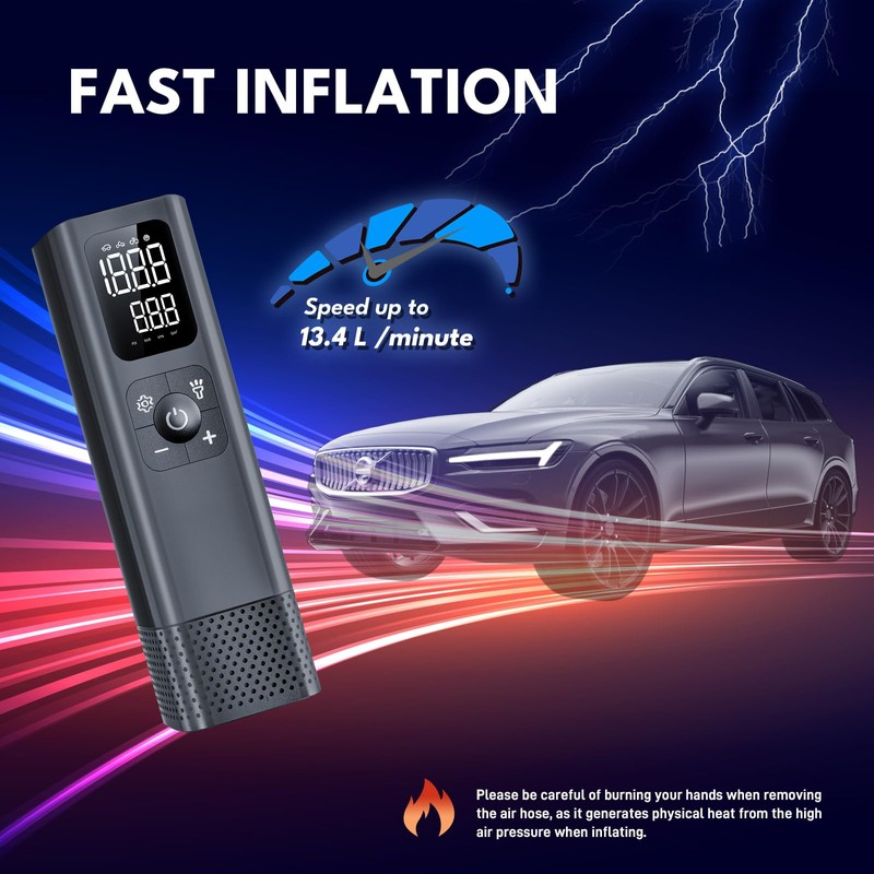 • Quick Inflation: Features a 10.8 ft power cord, supports DC12V cigarette lighter plug input, and is equipped with a 15-alloy cylinder and a high-speed motor spinning at 18,000 RPM, achieving a maximum inflation rate of 13.4 L/Min