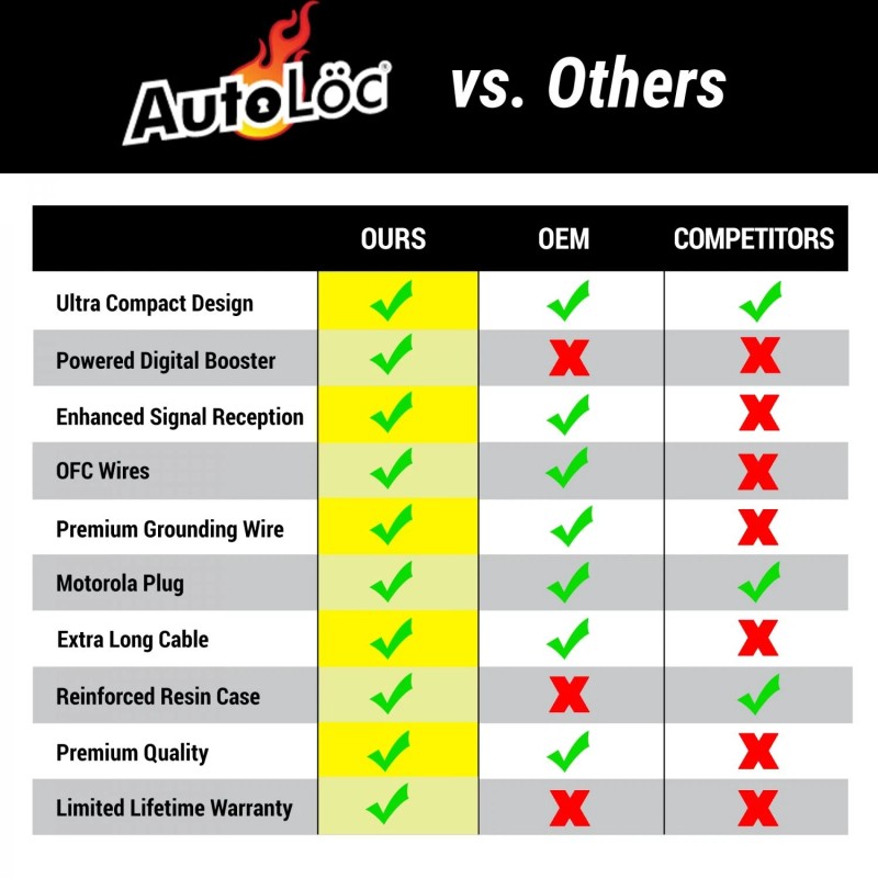 Our exclusive design includes a Motorola plug and added length to the shielded antenna cable. This makes for much easier installation, without the need for extensions. It also helps to remove unwanted sounds by absorbing background noise.