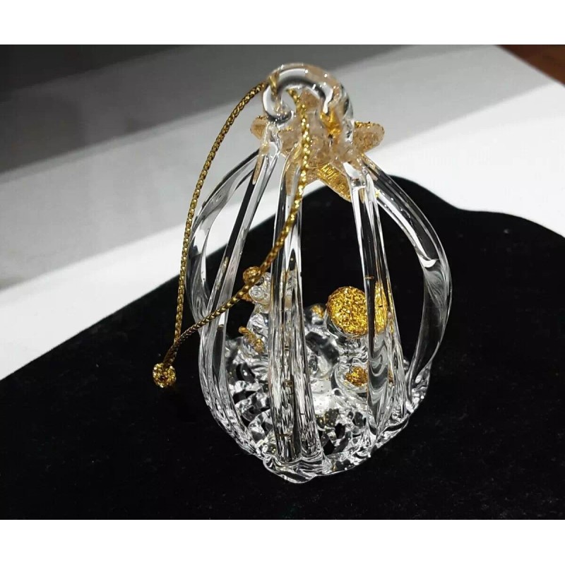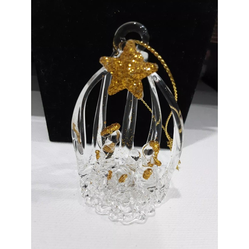 This beautiful ornament is made of spun glass. The ornament measures 2.5" x 1.5" x 1" and is an oval shape, with clear slats so that you can see the figures inside. Lovely designs of the holy family and has a gold cord for easy hanging. Glittering gold accents.