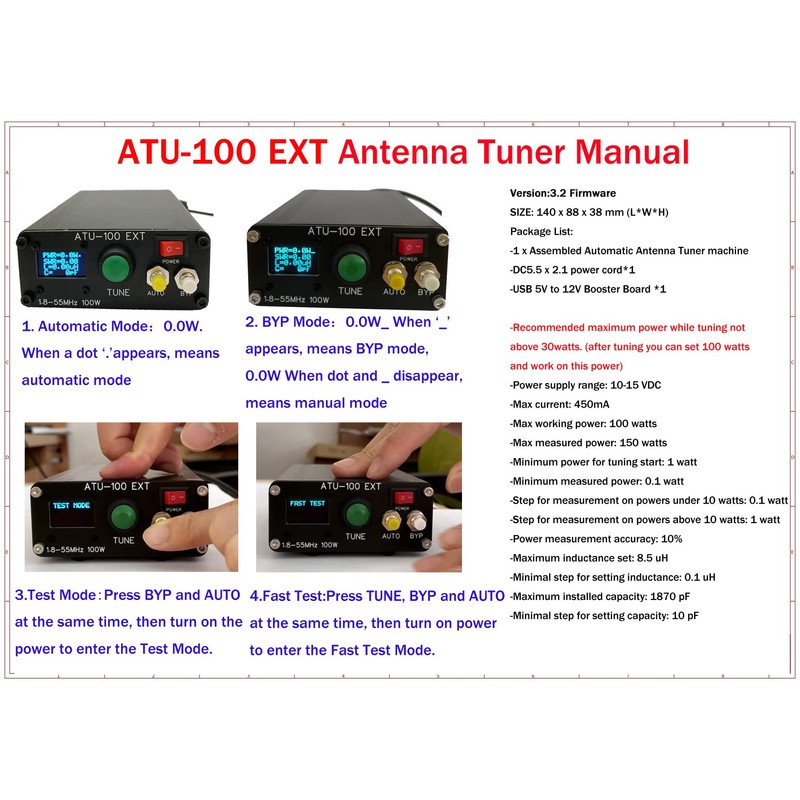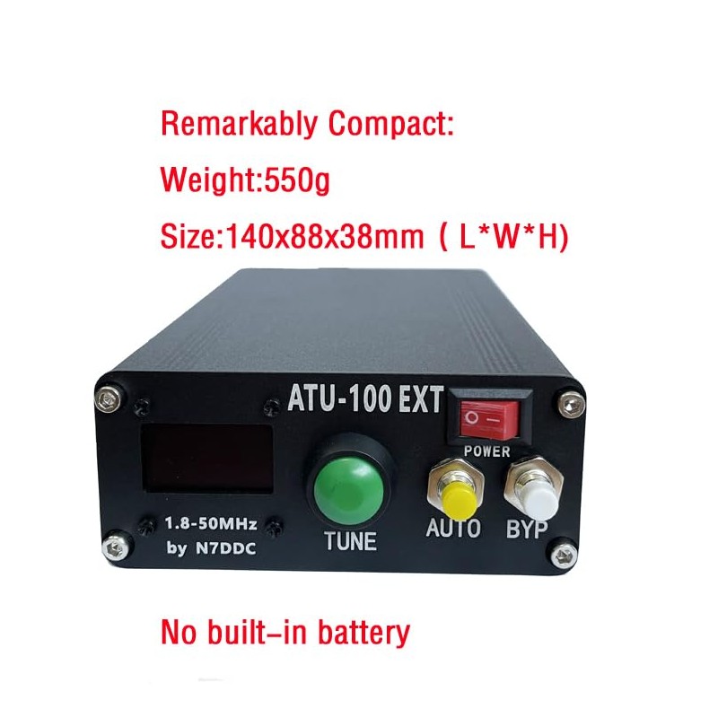 • What you get: ATU-100 automatic antenna tuner with metal housing (no battery), 1 x DC5.5 x 2.1 power cable (0.75 square pure copper wire 50 cm), 1 x USB 5V to 9V booster board.